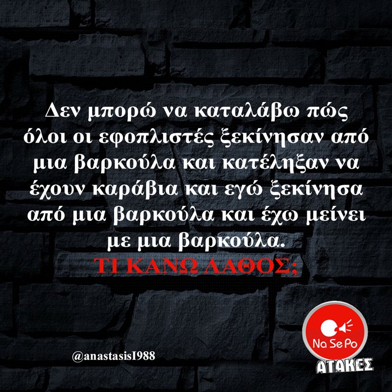 Δεν μπορώ να καταλάβω πώς όλοι οι εφοπλιστές ξεκίνησαν από μια βαρκούλα και κατέληξαν να έχουν καράβια και εγώ ξεκίνησα από μια βαρκούλα και έχω μείνει με μια βαρκούλα. ΤΙ ΚΑΝΩ ΛΑΘΟΣ; @anastasisI988