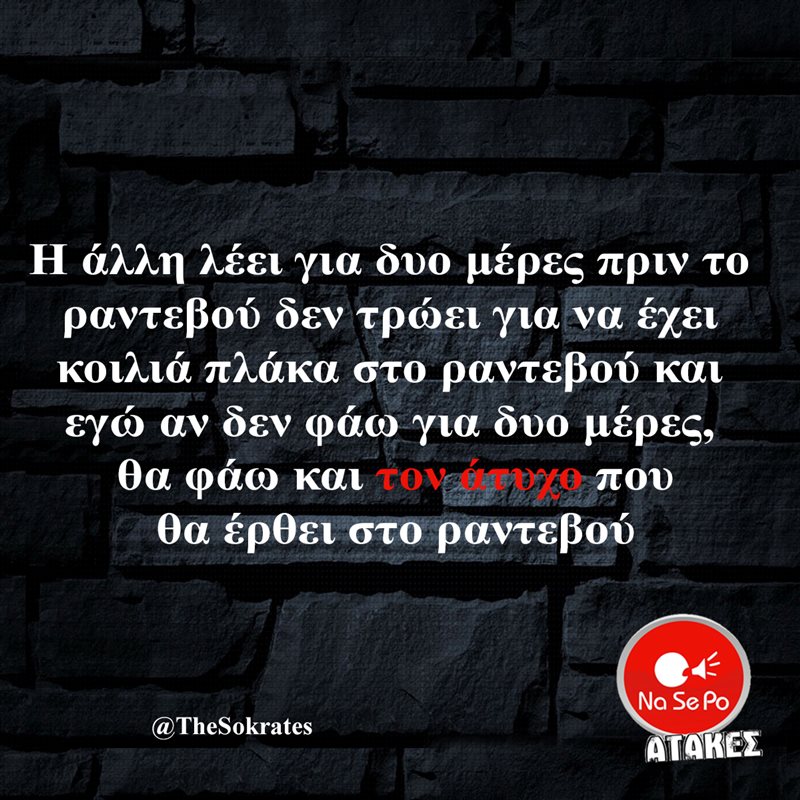 Η άλλη λέει για δυο μέρες πριν το ραντεβού δεν τρώει για να έχει κοιλιά πλάκα στο ραντεβού και εγώ αν δεν φάω για δυο μέρες, θα φάω και τον άτυχο που θα έρθει στο ραντεβού @TheSokrates