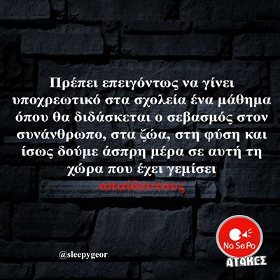 Πρέπει επειγόντως να γίνει υποχρεωτικό στα σχολεία ένα μάθημα όπου θα διδάσκεται ο σεβασμός στον συνάνθρωπο, στα ζώα, στη φύση και ίσως δούμε άσπρη μέρα σε αυτή τη χώρα που έχει γεμίσει απαίδευτους @sleepygeor