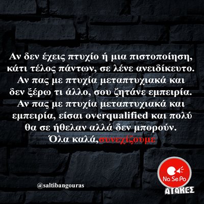 Αν δεν έχεις πτυχίο ή μια πιστοποίηση, κάτι τέλος πάντων, σε λένε ανειδίκευτο. Αν πας με πτυχία μεταπτυχιακά και δεν ξέρω τι άλλο, σου ζητάνε εμπειρία. Αν πας με πτυχία μεταπτυχιακά και εμπειρία, είσαι overqualified και πολύ θα σε ήθελαν αλλά δεν μπορούν. Όλα καλά,συνεχίζουμε @saltibangouras