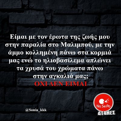 Είμαι με τον έρωτα της ζωής μου στην παραλία στο Μαλιμπού, με την άμμο κολλημένη πάνω στο κορμιά μας ενώ το ηλιοβασίλεμα απλώνει τα χρυσά του χρώματα πάνω στην αγκαλιά μας; ΟΧΙ ΔΕΝ ΕΙΜΑΙ @Sonia_kkk