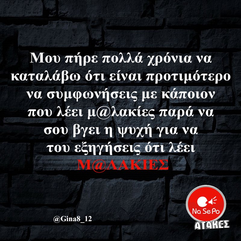 Μου πήρε πολλά χρόνια να καταλάβω ότι είναι προτιμότερο να συμφωνήσεις με κάποιον που λέει μ@λακίες παρά να σου βγει η ψυχή για να του εξηγήσεις ότι λέει Μ@ΛΑΚΙΕΣ @Gina8_12