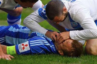 Παραλίγο τραγωδία.. Ο μέσος της Ντιναμό Κιέβου, Όλεγκ Γκούσεβ, συγκρούστηκε με τον τερματοφύλακα της Ντνίπρο, Ντένις Μπόικο και του γύρισε η γλώσσα! Δημιουργήθηκε πανικός, αποχώρησε με φορείο, αλλά τελικά είναι καλά...