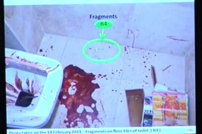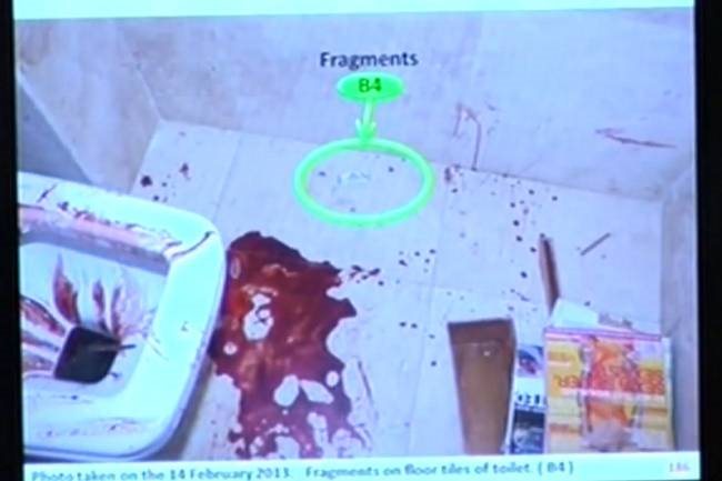 Την επίμαχη φωτογραφία παρουσίασε στο δικαστήριο ο Gerrie Nel και αποδεικνύει πού ήταν η στοίβα με τα περιοδικά στο μπάνιο όπου πυροβολήθηκε το μοντέλο από τη Νότια Αφρική και η οποία υποστηρίζει ο Παραολυμπιονίκης ότι μετακινήθηκε από την αστυνομία αφού έφυγε.