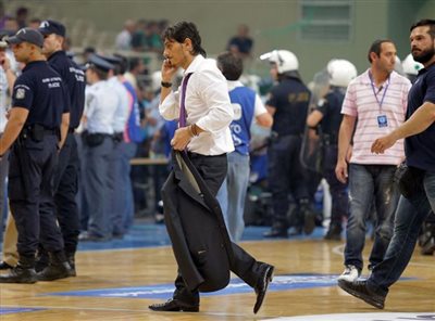 «Σήμερα ο αγώνας δεν έπρεπε να έχει ξεκινήσει. Ξεκίνησε εκβιαστικά μ’ ένα δίλημμα που μας έβαλε ο κ. Σχινάς ή να ξεκινήσει ή να μηδενιστούμε. Οι κανονισμοί του ΕΣΑΚΕ είναι σαφείς. 22 άτομα επιτρέπονται από μια φιλοξενούμενη ομάδα στην αποστολή. Σήμερα ήρθαν 29 από τον Ολυμπιακό. Κάποια στιγμή πρέπει να μάθουμε να εναρμονιζόμαστε με τους κανόνες.