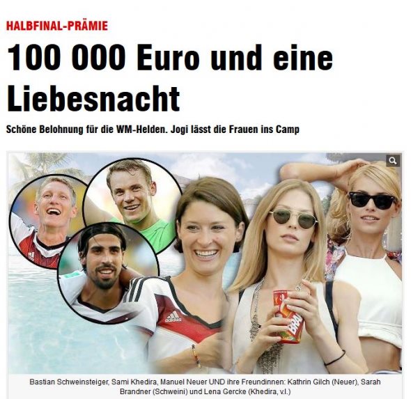 Ένα ιδιαίτερο μπόνους κέρδισαν οι Γερμανοί, μετά τη νίκη τους επί της Γαλλίας με 1-0 και την πρόκρισή τους στα ημιτελικά του Μουντιάλ. Ποιο ήταν το δώρο; Σύμφωνα με την εφημερίδα Bild, εκτός από τα 100.000 ευρώ που θα πάρει κάθε παίκτης για το εισιτήριο που εξασφάλισε η ομάδα για τους "4" του παγκοσμίου κυπέλλου, είχαν την ευκαιρία να περάσουν και μια νύχτα με τις συντρόφους τους. Το χαρμόσυνο νέο ανακοίνωσε στους ποδοσφαιριστές ο προπονητής των "πάντσερ" Γιοάκιμ Λεβ κατά τη διάρκεια της προπόνησης του Σαββάτου. Τους είπε δηλαδή ότι στο Κάμπο Μπαίο, όπου διαμένει η αποστολή της Εθνικής Γερμανίας, τους περιμένουν οι γυναίκες τους.