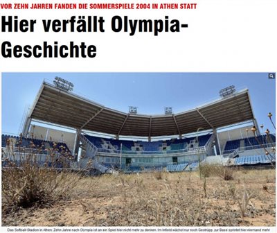 «Εδώ καταρρέει η ολυμπιακή ιστορία» είναι ο τίτλος εκτενούς φωτογραφικού ρεπορτάζ που φιλοξενείται στην ηλεκτρονική σελίδα της γερμανικής εφημερίδας «Bild» και αναφέρεται στην σημερινή κατάσταση των ολυμπιακών εγκαταστάσεων της Αθήνας.