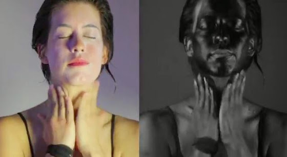 Όπως βλέπετε και στην παρακάτω φωτογραφία, είναι σαν να γινόμαστε "αόρατοι" από τον ήλιο, όταν βάζουμε αντηλιακό. Το μαύρο χρώμα που βλέπετε είναι επειδή ο υπεριώδης φωτισμός της κάμερας (όπως και η υπεριώδης ακτινοβολία του ήλιου) δεν "βλέπει" την επιδερμίδα.
