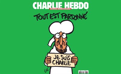 "Όλα συγχωρούνται". Αυτός ο τίτλος συνοδεύει το σκίτσο του δακρυσμένου προφήτη Μωάμεθ που κρατάει ένα πλακάτ με την περίφημη φράση "Je suis Charlie" στο εξώφυλλο του Charlie Ebdo, μετά την πολύνεκρη επίθεση στα γραφεία του περιοδικού.