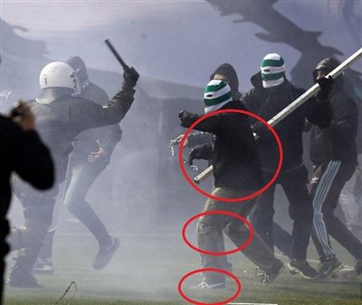 Όπως φαίνεται στις φωτογραφίες που δόθηκαν στη δημοσιότητα ο 36χρονος κρατούσε στο δεξί του χέρι μεταλλική αλυσίδα και ο 26χρονος φορούσε κουκούλα τύπου full face χρώματος πράσινου λευκού και κρατούσε στο δεξί του χέρι φωτοβολίδα.