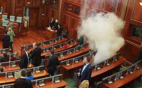 Εντός της Βουλής του Κοσόβου η αντιπολίτευση προσπάθησε να εισέλθει στην αίθουσα στη διάρκεια συνεδρίασης και επειδή δεν τα κατάφερε έριξε δακρυγόνο στο διάδρομο έξω από την αίθουσα. Επίσης, ο ιδρυτής και βουλευτής του αντιπολιτευόμενου κινήματος "Αυτοδιάθεση" Αλμπίν Κούρτι, ψέκασε με σπρέι πιπεριού προς τον πρωθυπουργό Ίσα Μουστάφα και μέλητης κυβέρνησης, σε ένδειξη διαμαρτυρίας για τη συμφωνία Βελιγραδίου - Πρίστινας για τη συγκρότηση Ένωσης Σερβικών Δήμων στο Κόσοβο.